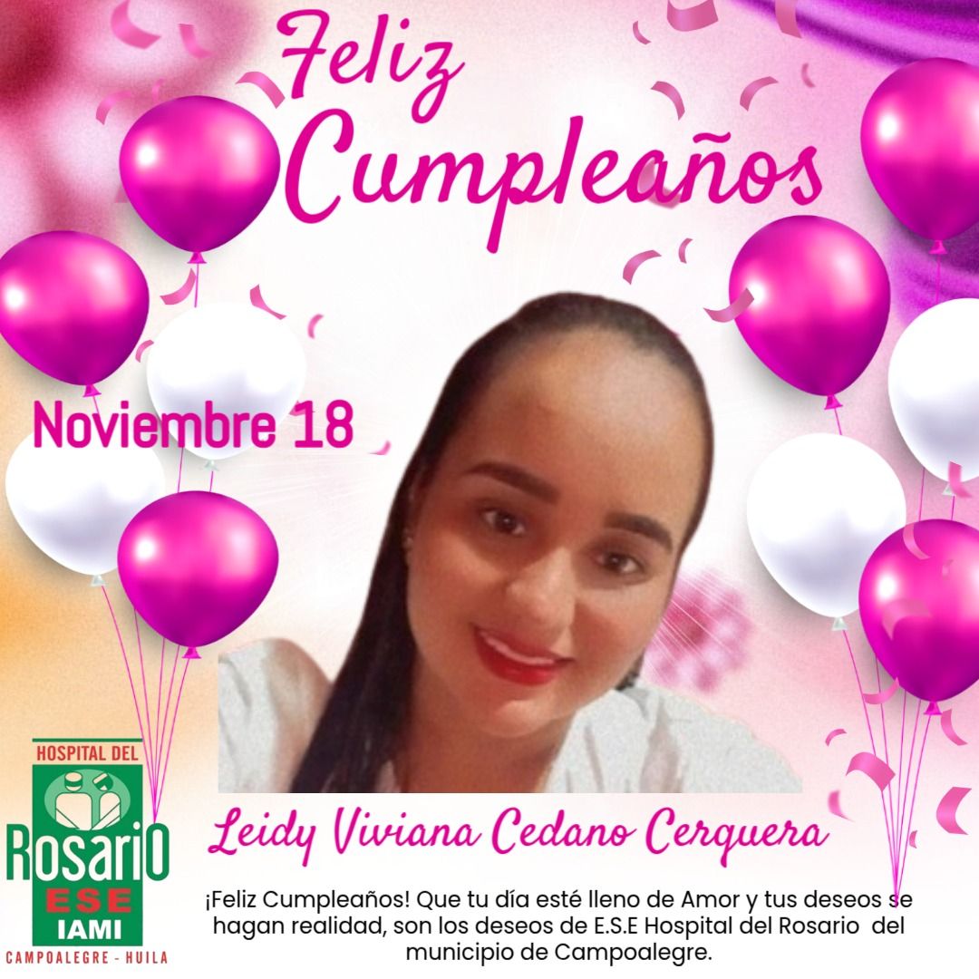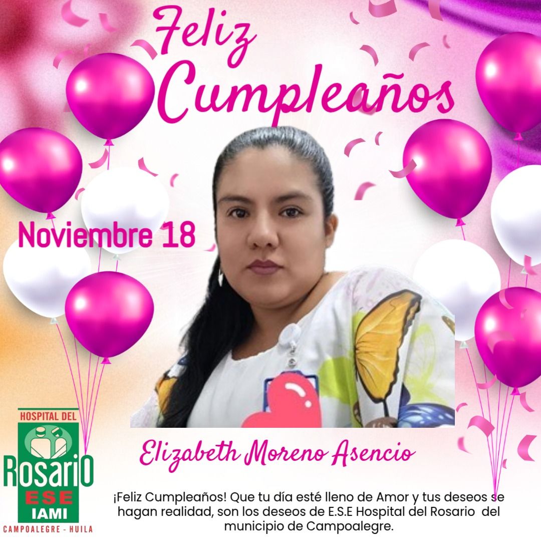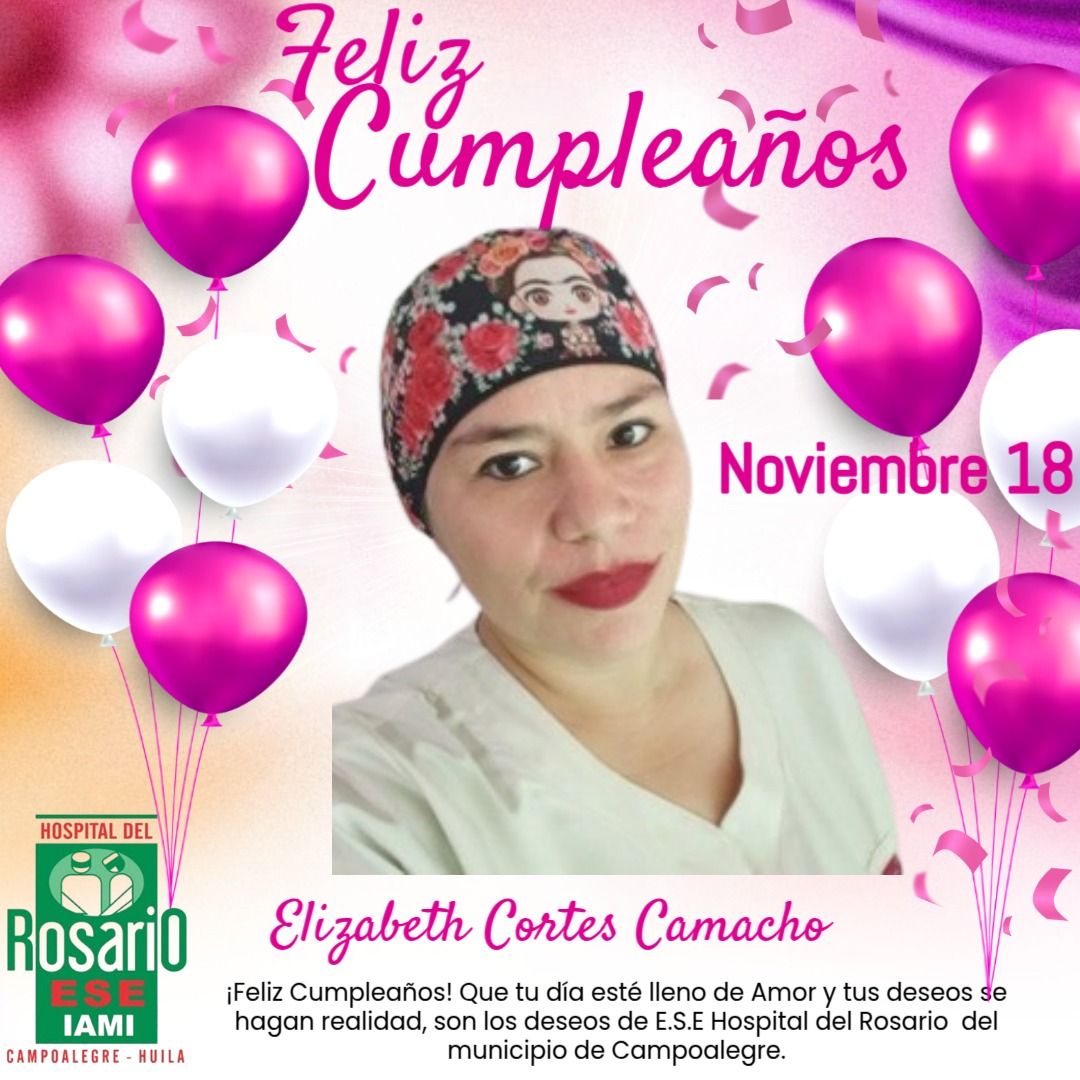 La E.S.E. Hospital del Rosario de Campoalegre extiende un cordial saludo de felicitación a las funcionarias Elizabeth Moreno Asencio, Leidy Viviana Cedano Cerquera Elizabeth Cortes Camacho y Maira Alejandra Carvajal Navarro, adscritas al área asistencial, con motivo de la celebración de su cumpleaños.