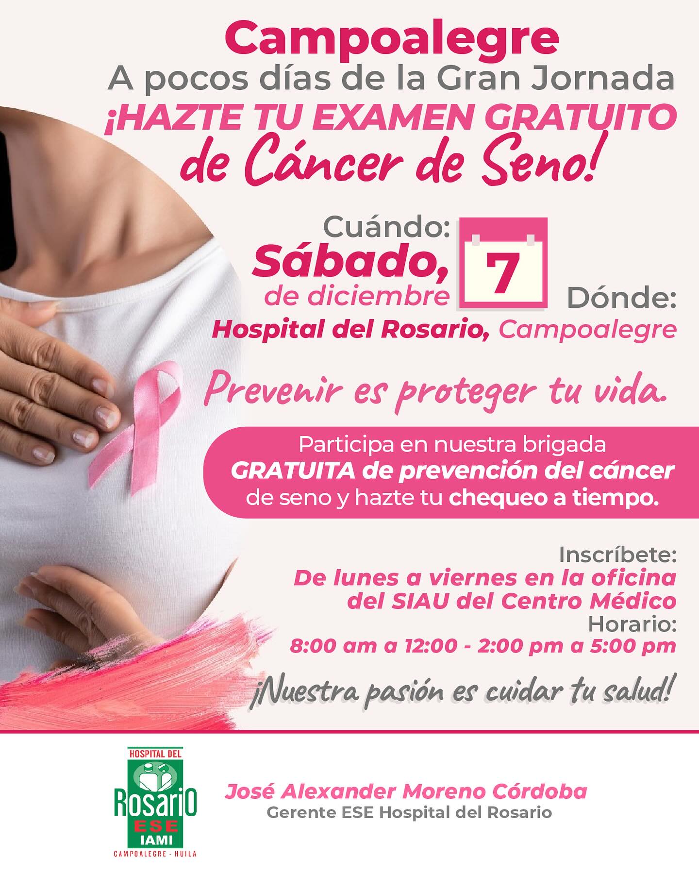 La E.S.E. Hospital del Rosario de Campoalegre te invita a nuestra Jornada Gratuita de Prevención del Cáncer de Seno, dirigida a mujeres afiliadas a cualquier EPS.