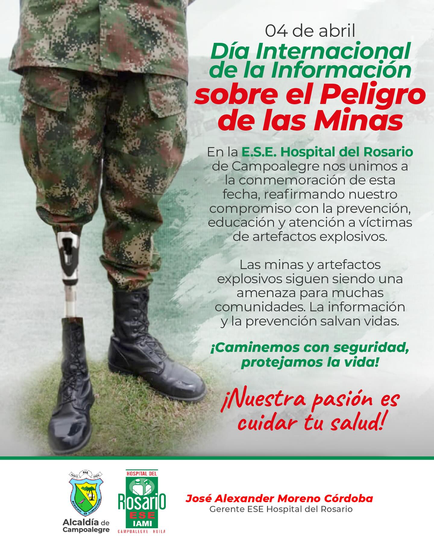 En la E.S.E. Hospital del Rosario de Campoalegre, nos unimos a esta conmemoración reafirmando nuestro compromiso con la prevención, educación y atención a víctimas de artefactos explosivos. Las minas y explosivos aún representan una amenaza para muchas comunidades. ¡Nuestra