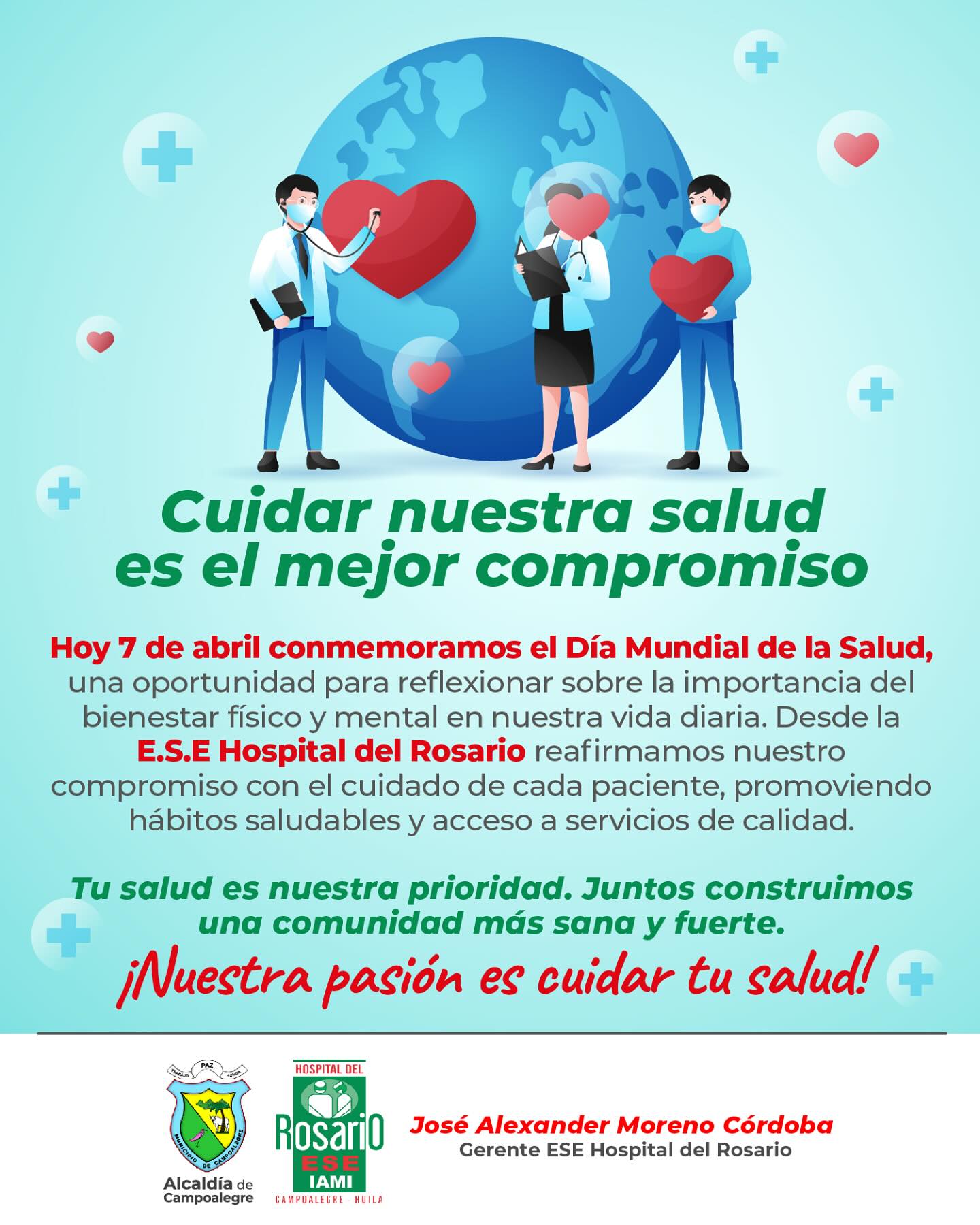 Cuidar de nuestra salud es el mejor compromiso que podemos asumir. En esta fecha especial, desde la E.S.E Hospital del Rosario, reafirmamos nuestro compromiso con el bienestar de cada paciente, promoviendo hábitos saludables y garantizando acceso a servicios de