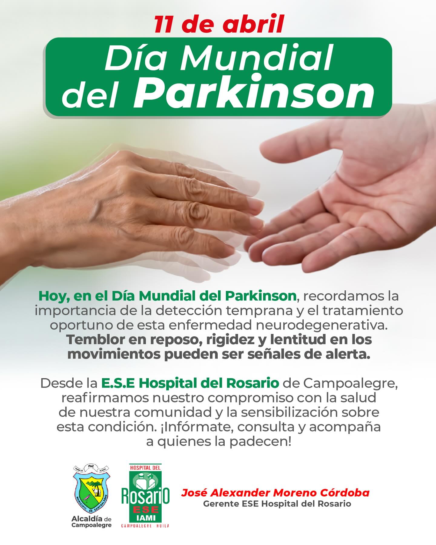 La detección temprana hace la diferencia. Temblor en reposo, rigidez y lentitud en los movimientos pueden ser señales de alerta. Desde la E.S.E Hospital del Rosario de Campoalegre, reafirmamos nuestro compromiso con la sensibilización y el cuidado de quienes