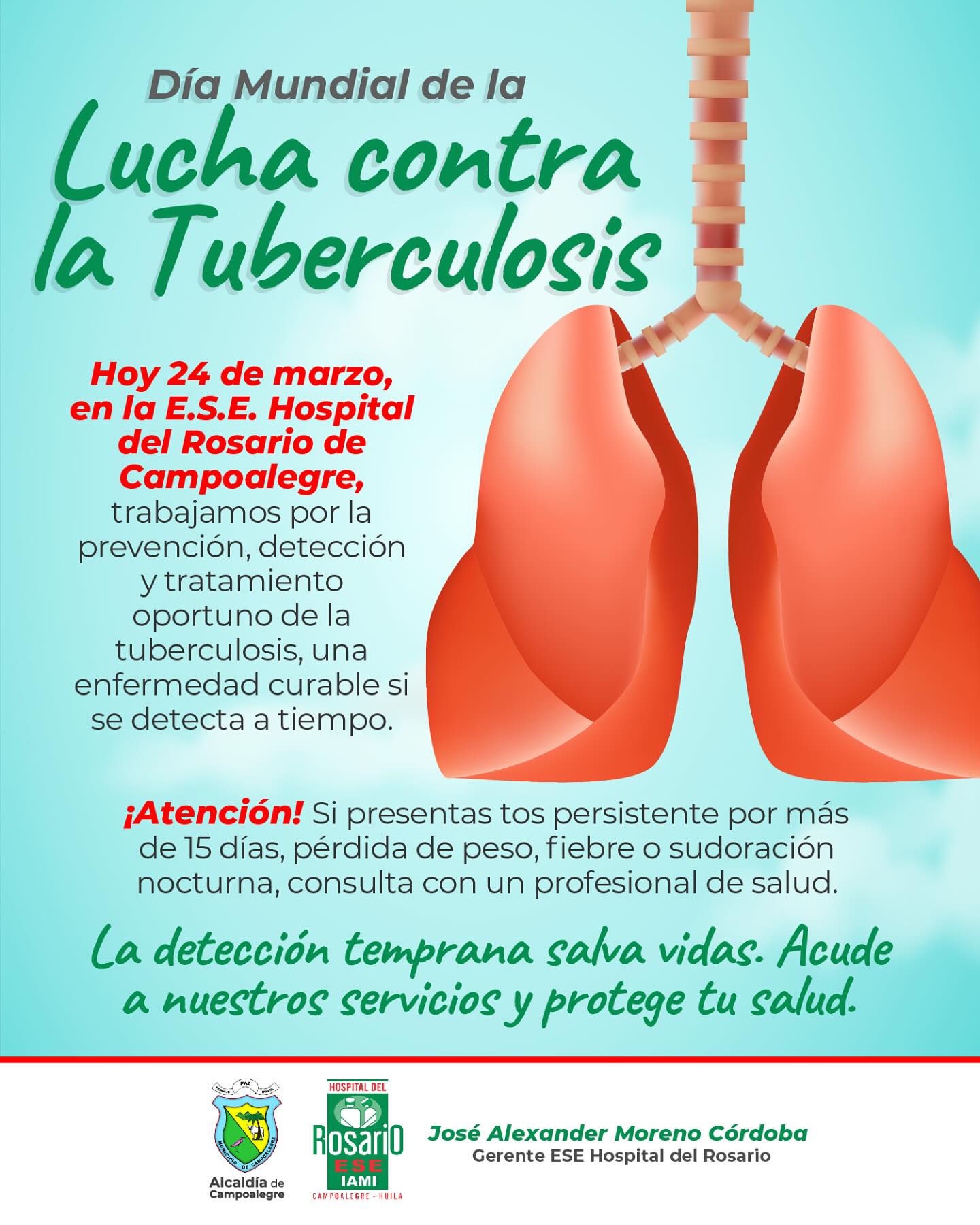 En la E.S.E. Hospital del Rosario de Campoalegre trabajamos por la prevención y detección temprana de la tuberculosis. Si tienes tos persistente por más de 15 días, fiebre, sudoración nocturna o pérdida de peso, consulta con un profesional de