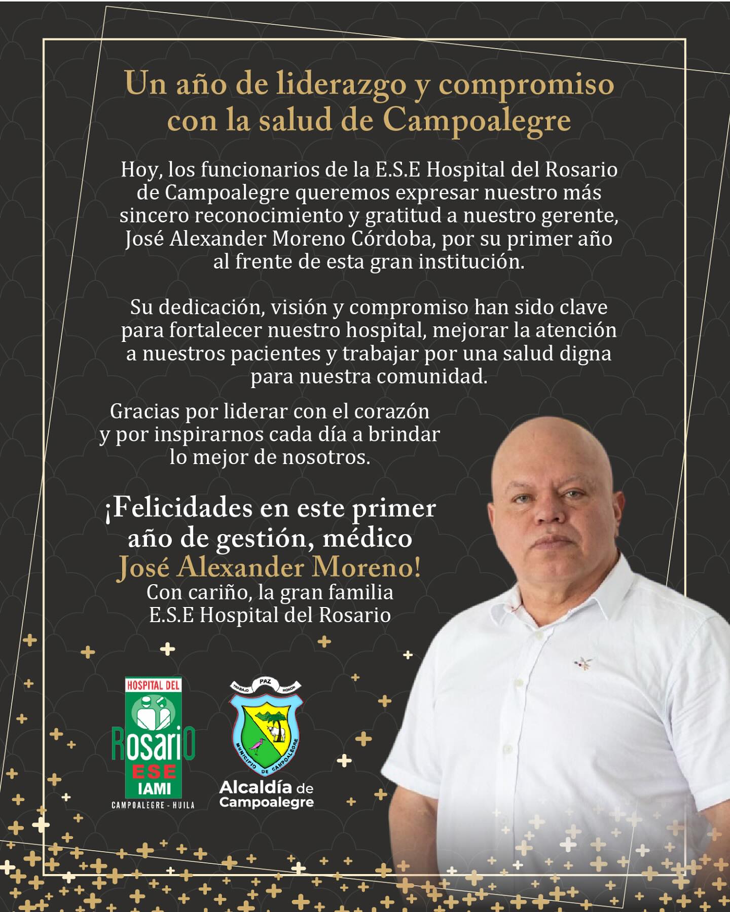 Los funcionarios de la E.S.E Hospital del Rosario de Campoalegre felicitan a nuestro gerente, José Alexander Moreno Córdoba, por su primer año de gestión. Su compromiso y liderazgo han sido fundamentales para fortalecer la atención en salud y mejorar