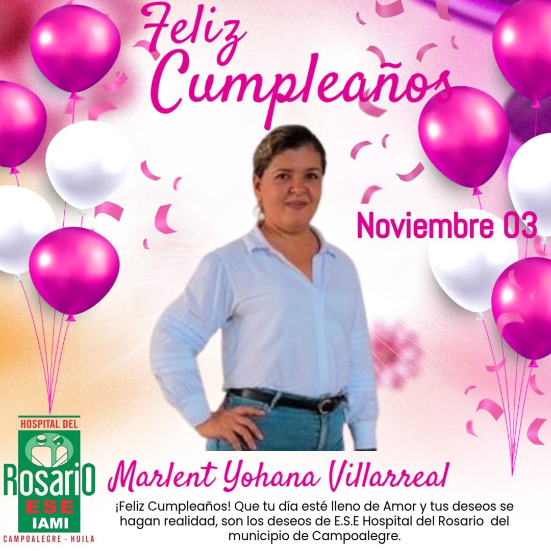 La E.S.E. Hospital del Rosario de Campoalegre extiende un cordial saludo de felicitación a la funcionaria Marlent Yohana Villarreal, adscrita al área administrativa, con motivo de la celebración de su cumpleaños. La institución reconoce