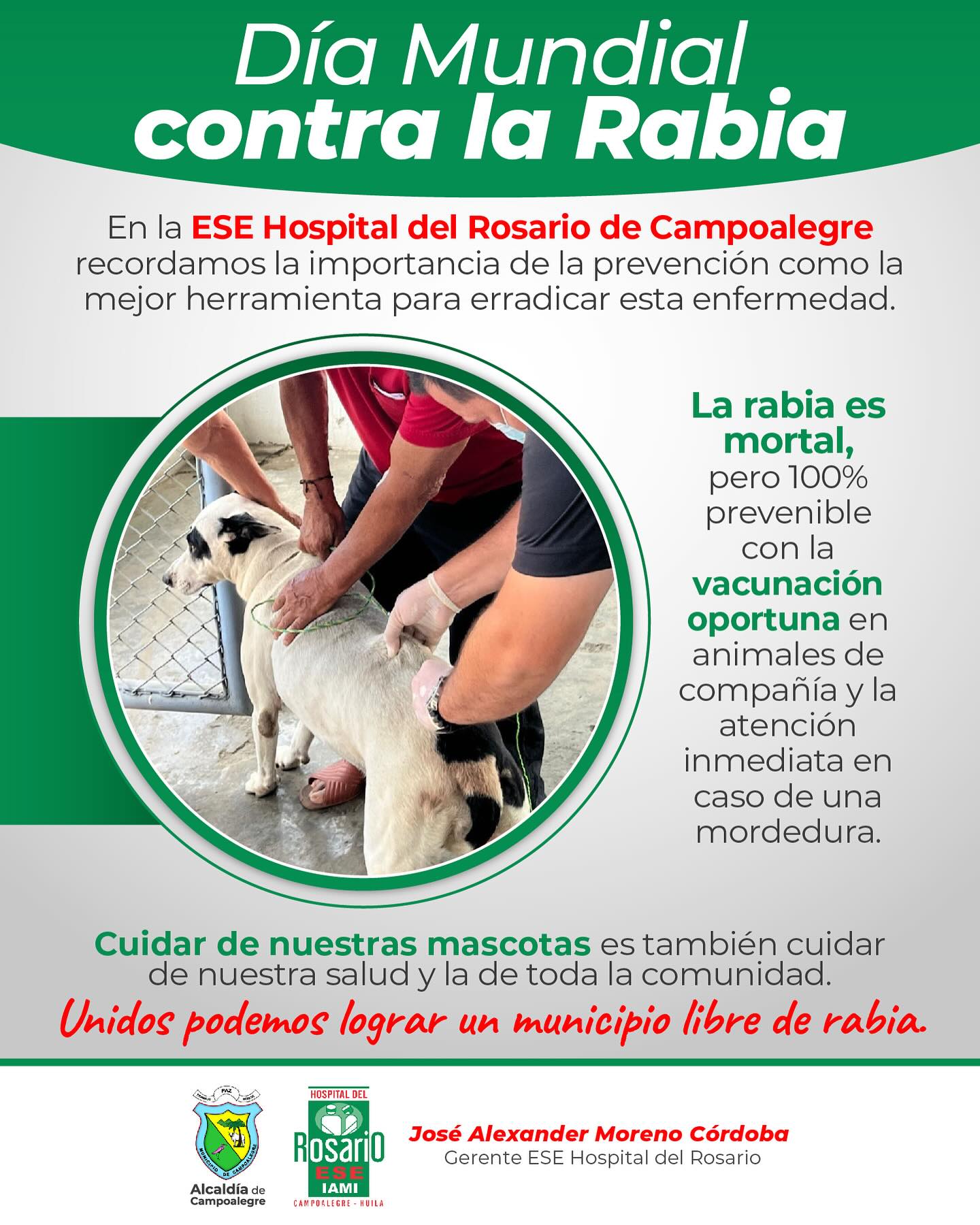 En el Día Mundial contra la Rabia, desde la ESE Hospital del Rosario de Campoalegre reiteramos la importancia de la prevención. La rabia es mortal, pero puede prevenirse con vacunación oportuna y atención inmediata