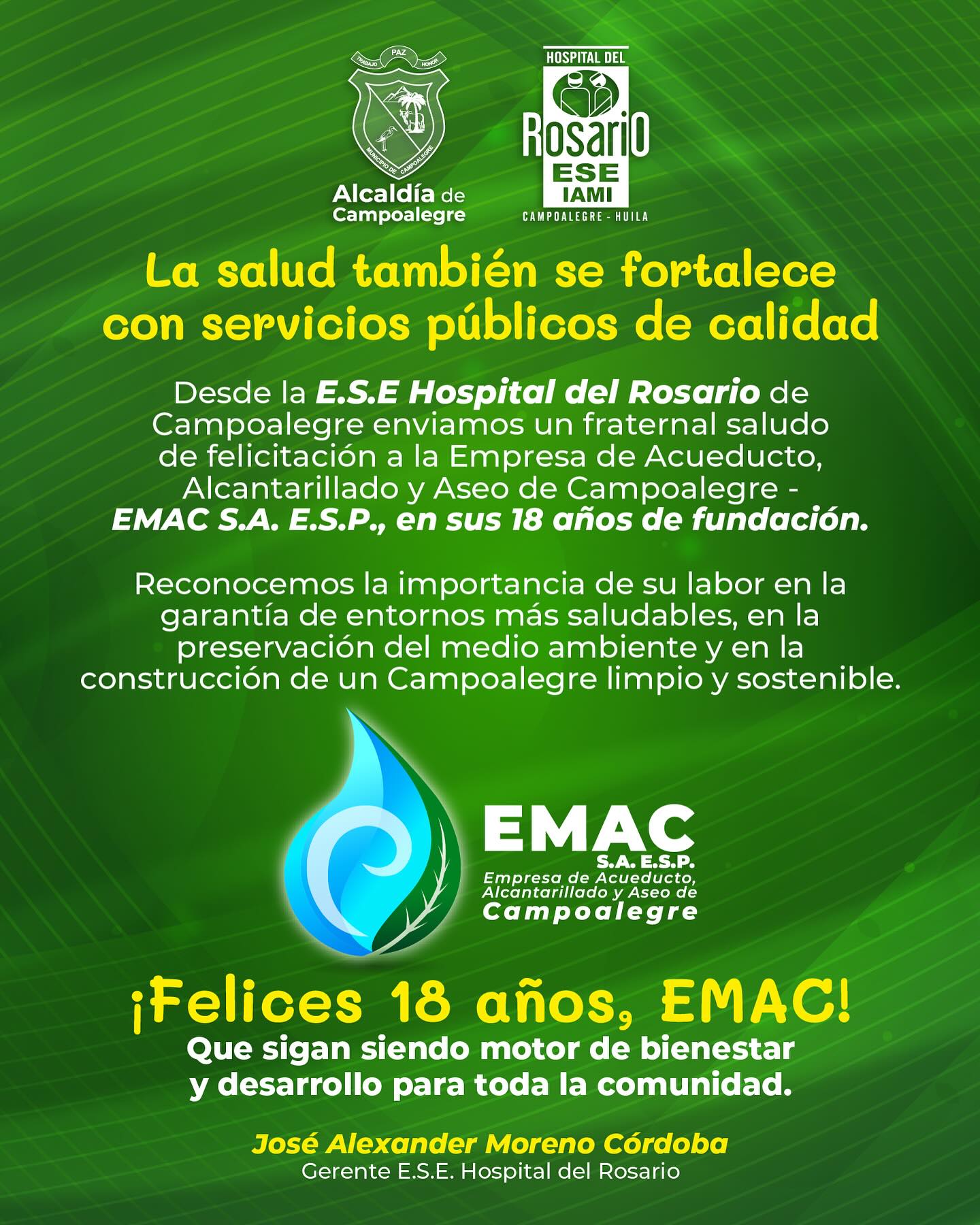 Desde la E.S.E Hospital del Rosario felicitamos a la EMAC S.A. E.S.P. por sus 18 años de servicio, aportando a un Campoalegre más limpio, saludable y sostenible. Felices 18 años, EMAC. #HospitalDelRosario #Campoalegre