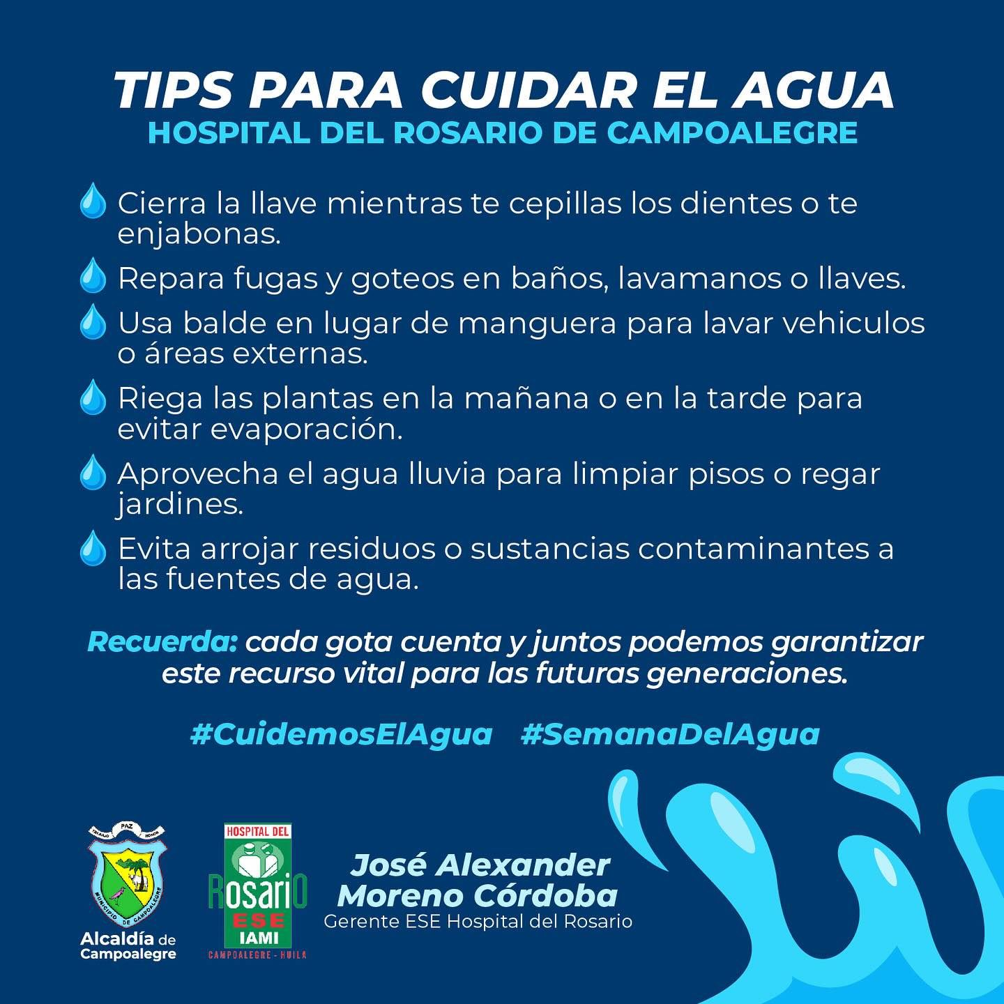 Desde la E.S.E Hospital del Rosario de Campoalegre te invitamos a adoptar pequeños hábitos que hacen una gran diferencia en el cuidado del agua, un recurso vital para todos. Aquí te dejamos algunos consejos