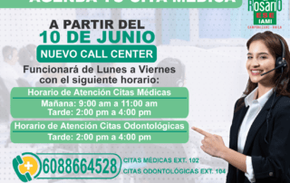 A partir del 10 de junio, la E.S.E Hospital del Rosario pone en funcionamiento su nuevo Call Center para la asignación de citas. Horarios de atención telefónica: - Citas médicas: - Lunes a viernes