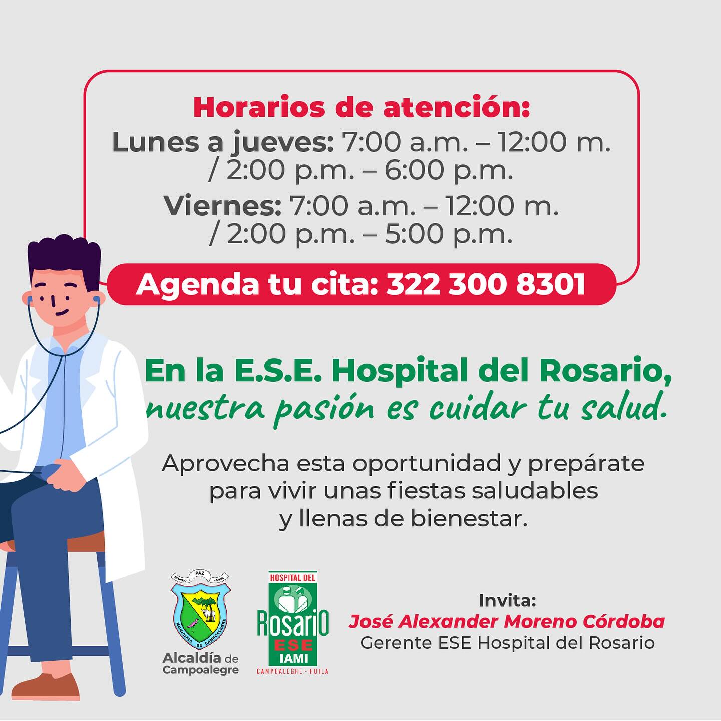 La E.S.E. Hospital del Rosario de Campoalegre invita a toda la comunidad a aprovechar la jornada de valoración integral y servicios del área de PYMS, orientados a promover el cuidado de la salud antes de la temporada decembrina.